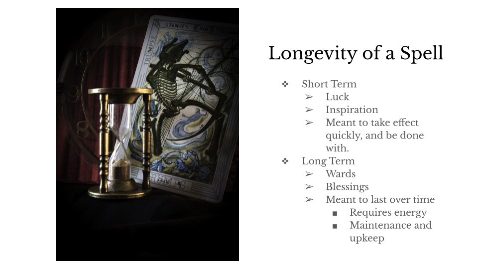 A short term spell could be a short luck spell, or a quick moment to re-center and bring calm. Anti-anxiety spells, cantrips and fast cast works meant to act right now, quickly, and then need no further reinforcement. A “find me a parking spot” spell, for example, does not need to be continually in effect, because you only need it to work when you’re looking for a parking spot.
