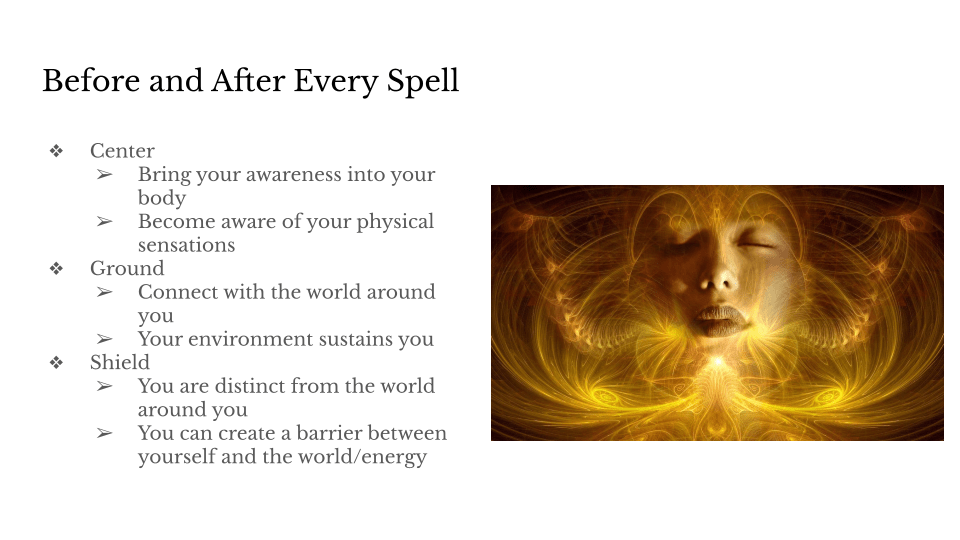 While you are casting a spell, or doing any work, you must at least thin your shield enough to allow your energy to move beyond yourself. Therefore, before you begin your energy work, make sure that you are centered in yourself, ground so that your energy is replenished, and double check that you are not harboring pockets of stagnant or otherwise unsuitable energies. After you have completed your work, whether for the day or in total, ground, center, and re-shield yourself. This will ensure that you do not remain attached to your work energetically; if you are still attached to the spell, it defacto becomes a long term work and will drain your energies. In the next lesson, we’ll discuss ways to set up systems to power long term spells that don’t rely on using yourself as a battery.