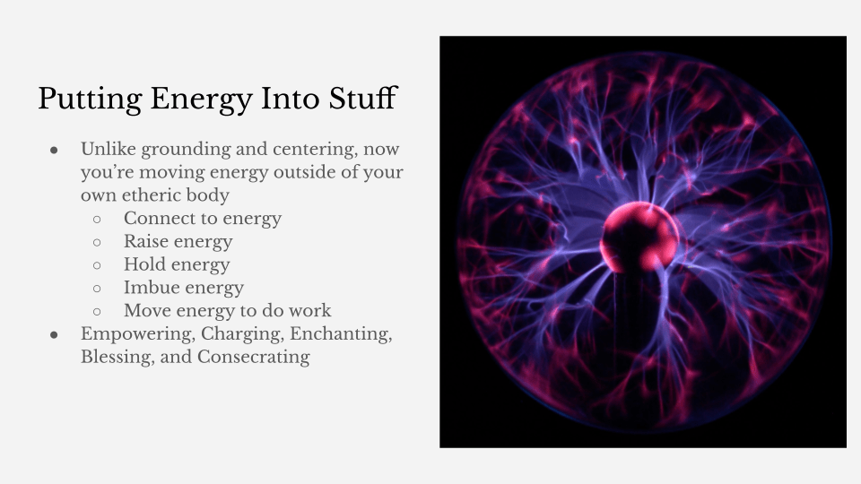 You now know all the stuff that leads up to finally making magic happen. You can ground, center, and shield yourself. You can raise energy, and you’ve been practicing holding onto and then releasing energy. You can connect energetically with an energy source, pull energy from that source, and have started working towards imbuing an intention or purpose into that energy. Time to apply these skills! We’re gonna learn about putting energy into a thing, so that it does a specific job for you, from within the thing.