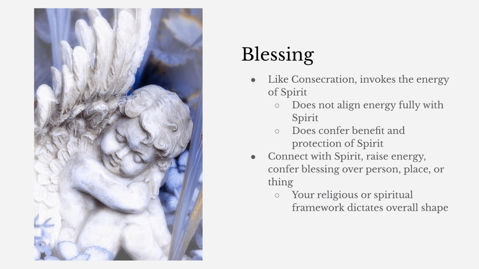 A blessing is like a consecration, but where consecration creates a link to a sacred or divine energy/entity, a blessing creates a much lighter linkage, and invites the positive energies to watch over and protect that which was blessed. Buildings, people, and objects can be blessed. Usually those things are blessed in the name of a being or entity, invoking that being/entities protection and oversight.