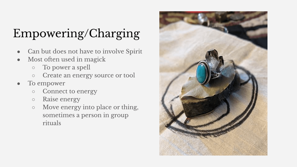 To Empower or Charge something is to put energy into it. A crystal can be empowered to do all sorts of things. In empowering, you’re going to pull energy, imbue it with intent, and then put that energy into a thing. Where Consecration and Blessing both call upon outside beings for assistance (an example of using an ally in your work), empowering does not need or call for the attention or oversight of any entity. You do all the work, from raising energy, imbuing it with your intention, and then putting it into the item empowered. Usually, empowered things are given power to do a specific job, for a limited span of time.